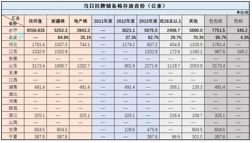1.當日輪出上市儲備棉中有部分為分批抽樣公檢。抽樣比率及抽樣方法按照棉花國家標準規(guī)定,品質指標包括顏色級、軋工質量、長度、馬克隆值、斷裂比強度、長度整齊度指標;重量采用原入庫公檢結果,不再重新檢驗。