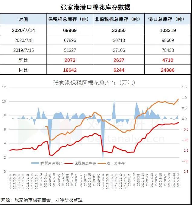 據(jù)張家港市棉花商會,截止2020年7月14日,張家港非保稅棉33350噸,保稅棉69969噸,共103319噸。進區(qū)6757噸,出區(qū)1975噸。