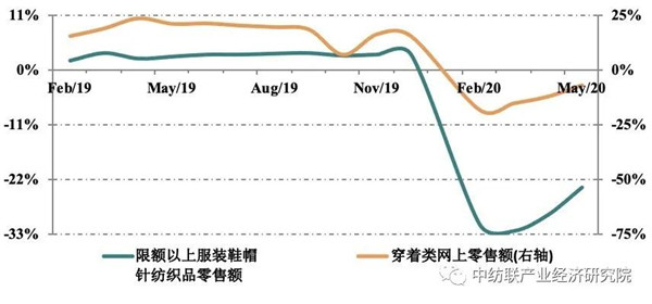 進(jìn)入2季度,我國疫情防控形勢持續(xù)向好,居民消費(fèi)活動增多,紡織品服裝內(nèi)需消費(fèi)溫和復(fù)蘇。據(jù)國家統(tǒng)計局?jǐn)?shù)據(jù),1-5月全國限額以上單位服裝鞋帽、針紡織品零售額同比下降23.5%,降幅較今年1-4月回升5.5個百分點。線上消費(fèi)持續(xù)好轉(zhuǎn),全國網(wǎng)上穿類商品零售額同比減少6.8%,降幅較1-4月收窄5.2個百分點。