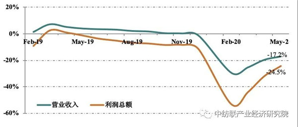 據(jù)國家統(tǒng)計局?jǐn)?shù)據(jù),1-5月全國3.3萬戶規(guī)模以上紡織企業(yè)實現(xiàn)營業(yè)收入15521.1億元,同比減少17.2%;實現(xiàn)利潤總額546億元,同比減少24.5%;營業(yè)收入利潤率為3.5%,低于上年同期0.4個百分點。產(chǎn)業(yè)鏈超八成環(huán)節(jié)利潤降幅超過10%,過半數(shù)環(huán)節(jié)利潤降幅仍達(dá)到30%以上。產(chǎn)業(yè)用紡織品行業(yè)在防疫物資拉動下盈利水平大幅提升,1-5月利潤總額同比增長189.1%,營業(yè)收入利潤率達(dá)到12.2%。
