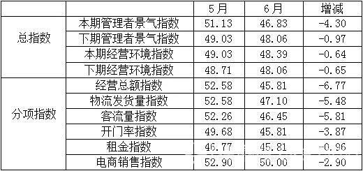 分項(xiàng)指數(shù)中,經(jīng)營總額指數(shù)為45.81,比5月的52.58下降6.77個(gè)百分點(diǎn);物流發(fā)貨量指數(shù)為47.10,比5月的52.58下降5.48個(gè)百分點(diǎn);客流量指數(shù)為46.45,比5月的52.26下降5.81個(gè)百分點(diǎn);開門率指數(shù)為45.81,比5月的49.68下降3.87個(gè)百分點(diǎn);租金指數(shù)為45.81,比5月的46.77下降0.96個(gè)百分點(diǎn);電商銷售指數(shù)為50.00,比5月的52.90下降2.90個(gè)百分點(diǎn)。