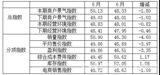 分項(xiàng)指數(shù)中,銷量指數(shù)為46.30,比5月的50.90下降4.60個(gè)百分點(diǎn);平均售價(jià)指數(shù)為45.89,比5月的49.86下降3.97個(gè)百分點(diǎn);盈利指數(shù)為46.51,比5月的49.86下降3.35個(gè)百分點(diǎn);綜合成本費(fèi)用指數(shù)為50.62,比5月的49.45上升1.17個(gè)百分點(diǎn);庫存指數(shù)為52.05,比5月的50.97上升1.08個(gè)百分點(diǎn);電商銷售指數(shù)為48.63,比5月的49.72下降1.09個(gè)百分點(diǎn)。