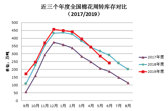 6月國(guó)內(nèi)棉花周轉(zhuǎn)庫(kù)存繼續(xù)下降。上旬紡企采購(gòu)較為積極,中下旬進(jìn)入紡織行業(yè)淡季,企業(yè)謹(jǐn)慎采購(gòu)原料,月末周轉(zhuǎn)庫(kù)存大幅下降。據(jù)中國(guó)棉花協(xié)會(huì)棉花物流分會(huì)對(duì)全國(guó)18個(gè)省市的154家棉花交割和監(jiān)管倉(cāng)庫(kù)調(diào)查數(shù)據(jù)顯示,6月底全國(guó)棉花周轉(zhuǎn)庫(kù)存總量約241.31萬(wàn)噸,較上月減少43.52萬(wàn)噸,降幅15.28%,低于去年同期50.43萬(wàn)噸。