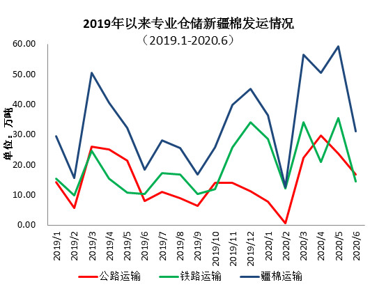 2019年度(2019年9月-2020年6月)出疆棉公路與鐵路共發(fā)運(yùn)373.78萬(wàn)噸,同比增加109.59萬(wàn)噸。