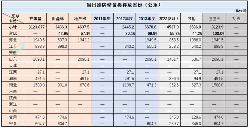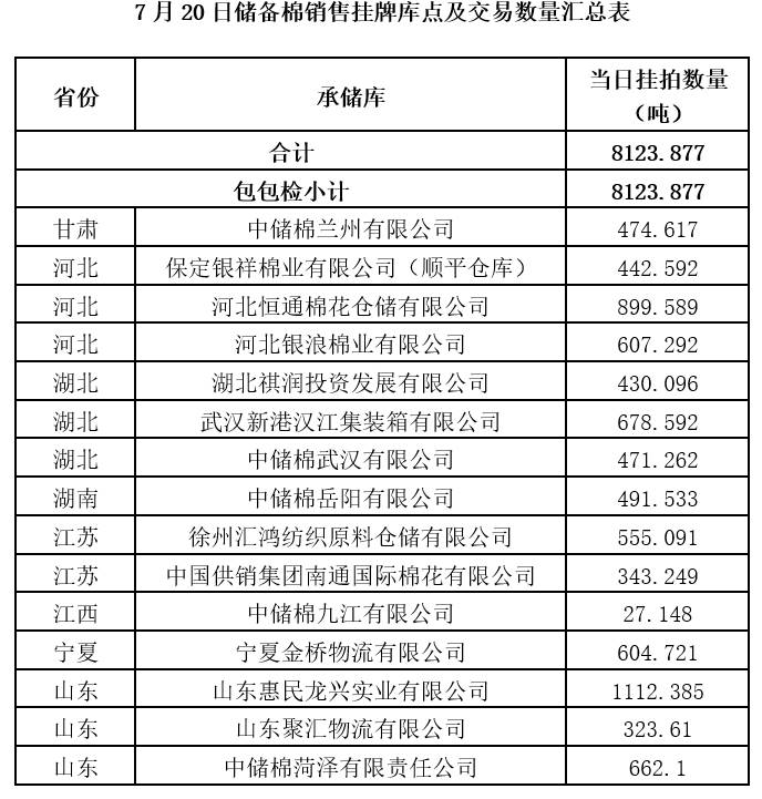 中國儲備棉管理有限公司定于7月20日上市銷售儲備棉重量8123.877噸,共31捆。具體庫點及數(shù)量見下表。