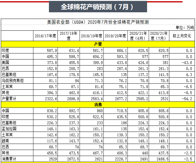 USDA發(fā)布7月棉花產(chǎn)需報告,大幅調(diào)減棉花產(chǎn)量,調(diào)減54.2萬噸至2531萬噸。其中主要調(diào)減美棉產(chǎn)量。全球棉花期末庫存也大幅下調(diào)41.3萬噸至2237.6萬噸,其中美棉期末庫存調(diào)減幅度最大。