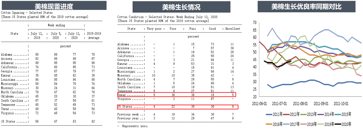 USDA7月13日發(fā)布美棉生產(chǎn)報告,截至7月12日,美棉現(xiàn)蕾率63%,較去年同期增加7個百分點,較過去5年平均值增加1個百分點。美棉結鈴進度18%,較去年同期持平,較過去5年平均值減少3個百分點。美棉生長狀況達到良好以上的占44%,較前周增加1個百分點,較去年同期減少12個百分點。其中得州優(yōu)良率23%,較前周增加1個百分點,差苗率41%,較前周增加5個百分點。