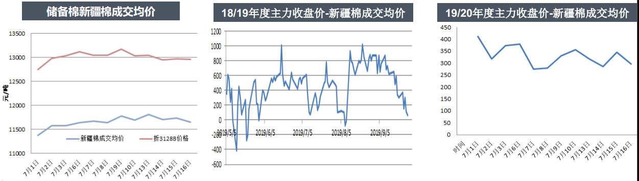 從7月1-16日,儲備棉上市9天,累計上市9.66萬噸,成交率100%,成交均價先漲后跌。7月16日平均成交均價由11508元/噸折3128價格12776元/噸。其中新疆棉成交均價11654元/噸,折3128價格12960元/噸,地產(chǎn)棉成交均價11367元/噸,折3128價格12598元/噸。