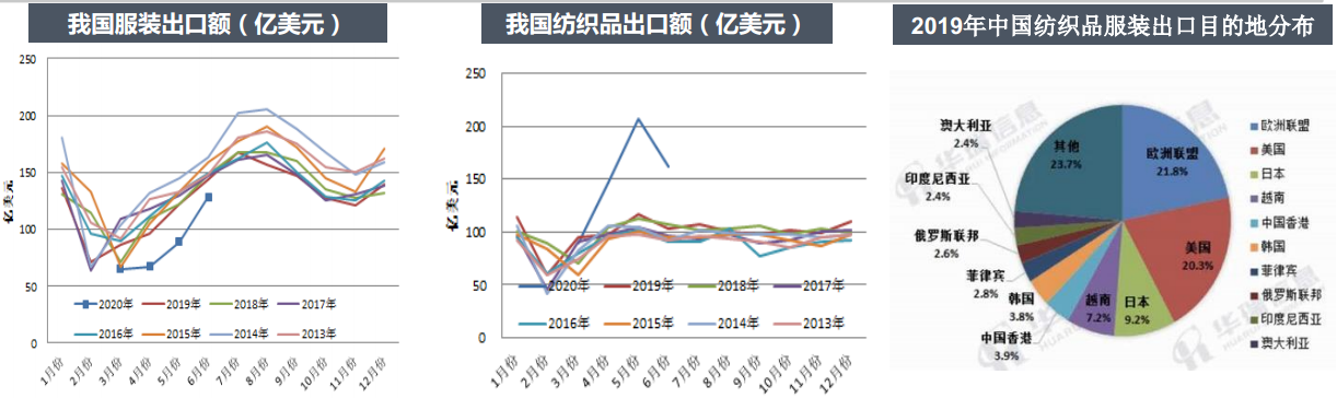 據(jù)海關統(tǒng)計,2020年6月我國紡織品服裝出口額290.32億美元,環(huán)比減少2%,同比增長18%。其中紡織品出口額161.57億美元,同比增長57%;服裝出口額128.75億美元,同比下降10%(5月份同比下降27%)。