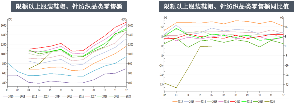 據(jù)國家統(tǒng)計局統(tǒng)計:6月我國社會消費品零售總額33526億元,同比下降1.8%。其中限額以上服裝鞋帽、針織品類零售額1059億元,同比下降0.1%。1-6月服裝鞋帽、針織品類累計零售額5120億元,同比減少19.6%。