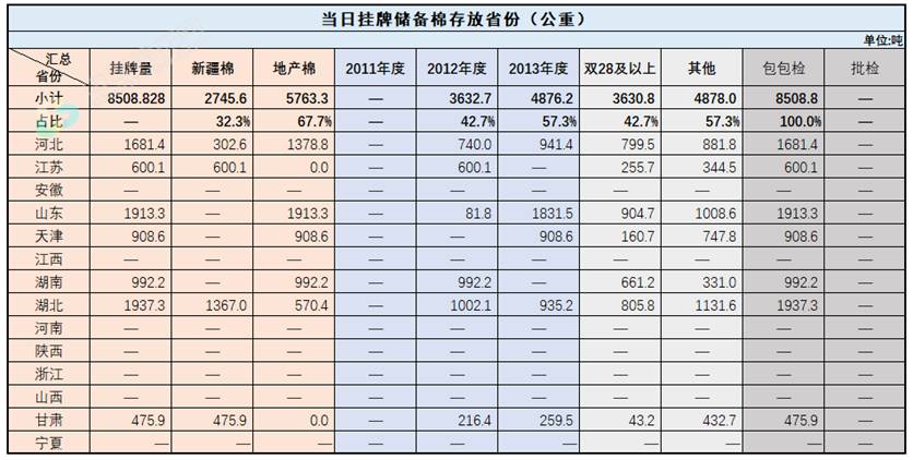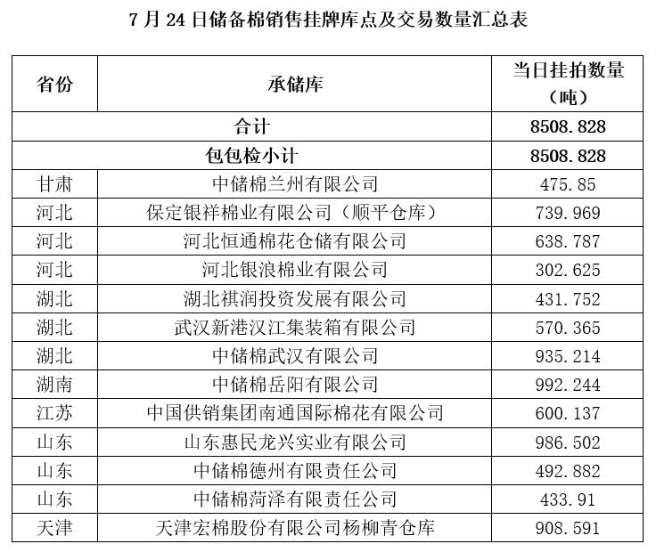 中國(guó)儲(chǔ)備棉管理有限公司定于7月24日上市銷售儲(chǔ)備棉重量8508.828噸,共32捆。具體庫(kù)點(diǎn)及數(shù)量見下表。