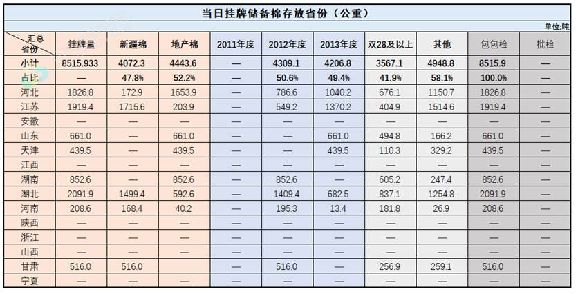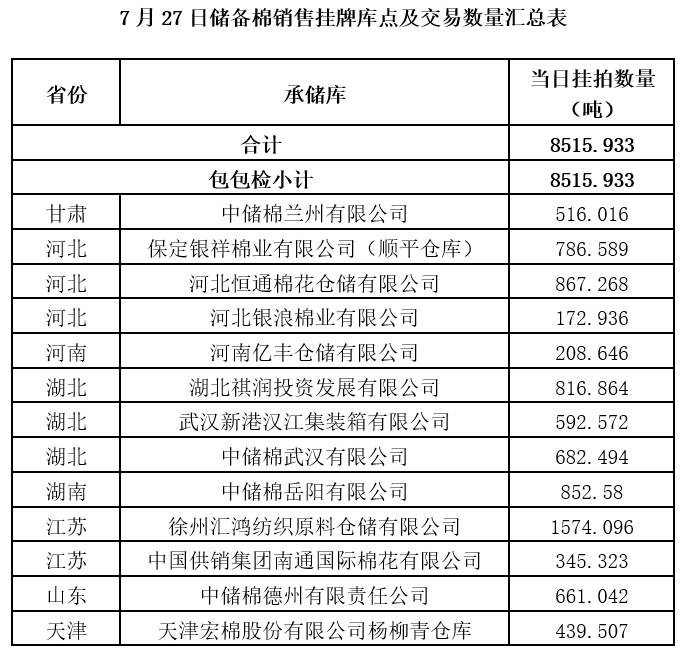 中國儲備棉管理有限公司定于7月27日上市銷售儲備棉重量8515.933噸,共38捆。具體庫點及數(shù)量見下表。