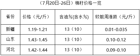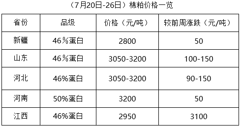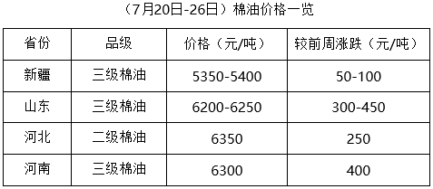 上周(7月20-26日),期貨大豆及豆類產(chǎn)品持續(xù)上漲,助推棉油、棉粕行情上漲。棉籽價(jià)格止跌大幅回升,進(jìn)一步刺激市場行情,但因油棉廠榨利不佳,開工率一般,棉籽成交少量,市場仍處進(jìn)一步調(diào)整中。
