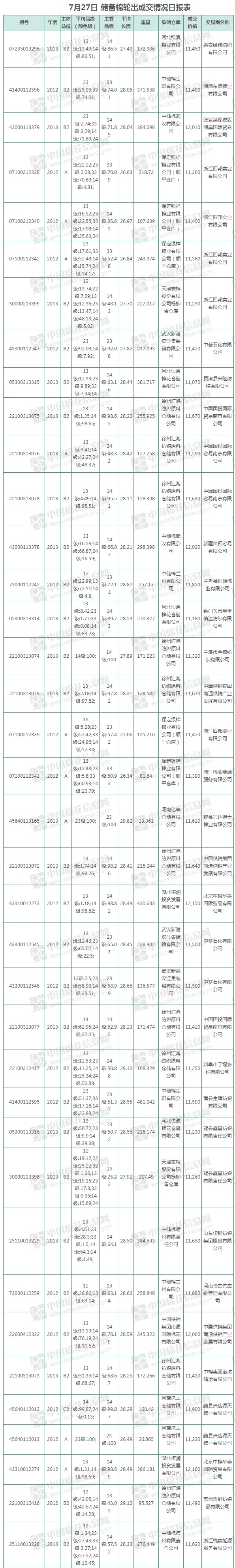 中國(guó)儲(chǔ)備棉管理有限公司定于7月27日上市銷售儲(chǔ)備棉重量8515.933噸,實(shí)際成交8515.933噸,成交率100%,成交均價(jià)11612元/噸,較24日上漲219元/噸,折3128價(jià)格12917元/噸,較24日上漲181元/噸。