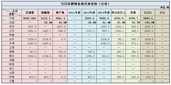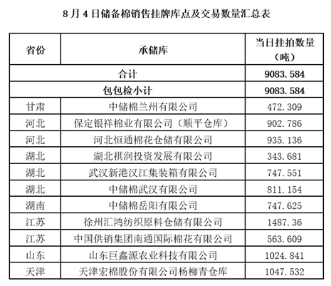 中國(guó)儲(chǔ)備棉管理有限公司定于8月4日上市銷售儲(chǔ)備棉重量9083.584噸,共41捆。具體庫(kù)點(diǎn)及數(shù)量見(jiàn)下表。
