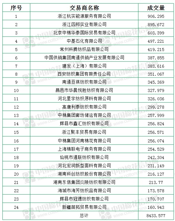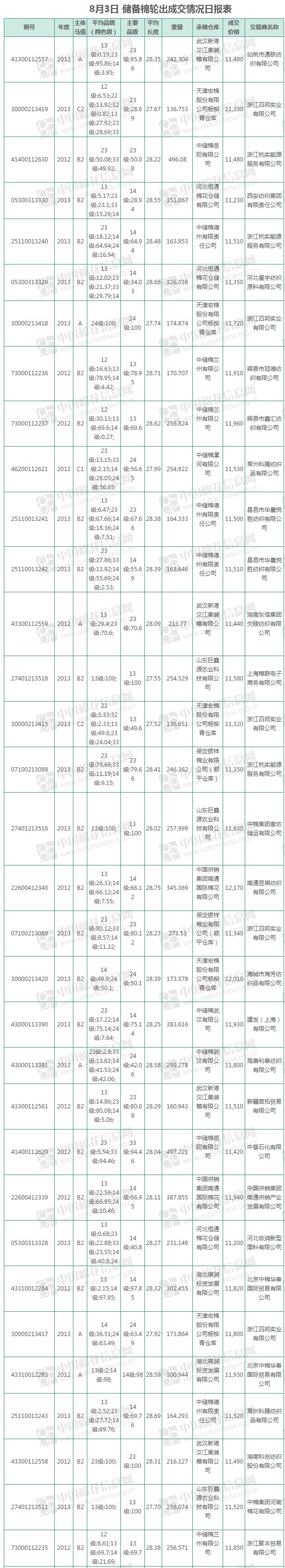 中國(guó)儲(chǔ)備棉管理有限公司定于8月3日上市銷售儲(chǔ)備棉重量8433.577噸,實(shí)際成交8433.577噸,成交率100%,成交均價(jià)11619元/噸,較31日上漲75元/噸,折3128價(jià)格12933元/噸,較31日上漲51元/噸。
