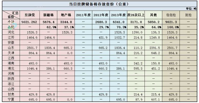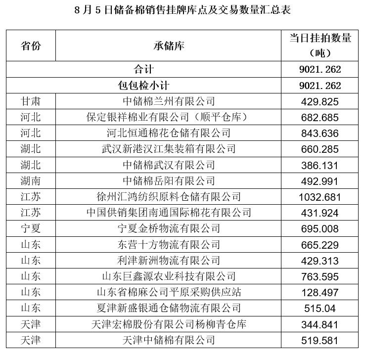 中國(guó)儲(chǔ)備棉管理有限公司定于8月5日上市銷售儲(chǔ)備棉重量9021.262噸,共43捆。具體庫點(diǎn)及數(shù)量見下表。