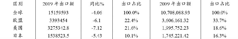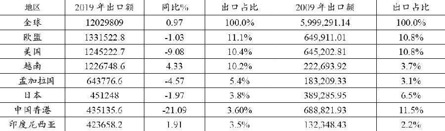 表為2009年和2019年中國服裝主要出口分布(單位:萬美元)