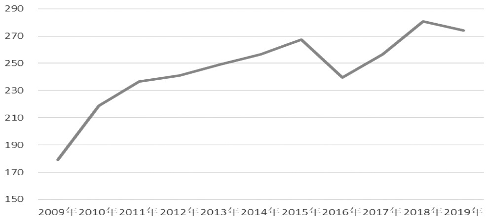 圖為歐盟10年間紡織品進口額走勢(單位:億歐元)