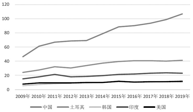 表為2009年和2019年中國紡織品主要出口分布(單位:萬美元)