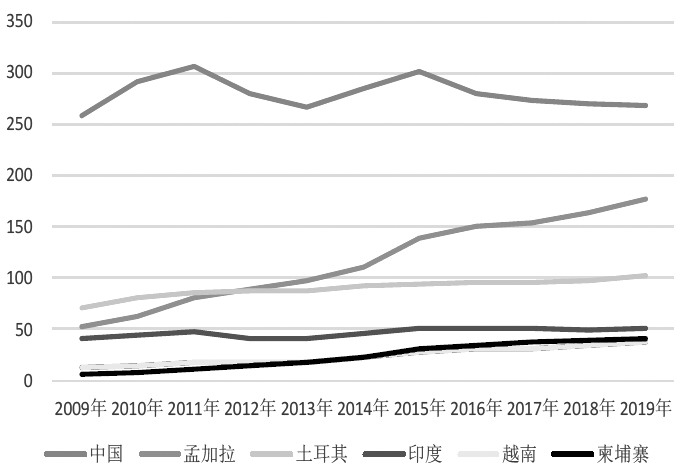 由此可以看出,在這10年間,越南服裝產(chǎn)業(yè)不斷壯大,產(chǎn)量及出口逐年提升,從某種程度來說,越南作為新興的服裝生產(chǎn)及出口國與中國存在競爭關(guān)系,搶占中國服裝出口份額。2019年這一情況更加明顯,美國自中國服裝進口金額占比同比下滑3.3%,越南同比增加1.43%,兩者在2019年的增幅均是10年間最大的一年,由于美國對來自中國的紡織品服裝加征關(guān)稅,美國服裝下游企業(yè)減少對中國服裝的進口,轉(zhuǎn)而增加對越南的服裝進口。其他進口國方面,孟加拉國、印度尼西亞、印度在10年間對美國的服裝出口金額均是逐年增長的,但曲線較越南平坦許多,占比方面,只有孟加拉國整體增長,2019年較10年前增加1.75%,印度尼西亞占比先增后減,整體波動不大,印度占比10年間波動不明顯。