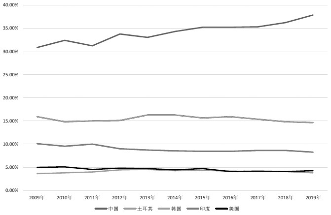 紡織品進口:中國份額最大但10年來占比變化不大,印度占比緩慢提升