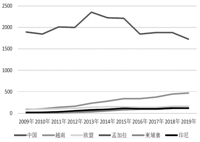 近些年,全球紡織服裝貿(mào)易流向悄然發(fā)生變化,中國作為最大的紡織品出口國和服裝出口國,在產(chǎn)業(yè)鏈中占據(jù)著重要的一環(huán)。因國際關(guān)系變動,及越南、孟加拉國、印度等國紡織服裝產(chǎn)業(yè)鏈崛起,國際紡織服裝貿(mào)易出現(xiàn)轉(zhuǎn)移現(xiàn)象,中國紡織品及服裝出口份額在部分地區(qū)被擠占,開始下滑。本文選取中國、歐盟、美國、日本作為研究目標(biāo),分析10年間中國紡織品及服裝出口的變化及歐盟、美國、日本進口的變化。歐盟、美國、日本是中國最大的紡織品及服裝出口地,同時也是全球紡織服裝貿(mào)易中舉足輕重的環(huán)節(jié),選取它們作為研究對象能夠更直觀地展現(xiàn)全球紡織服裝產(chǎn)業(yè)鏈變化趨勢。