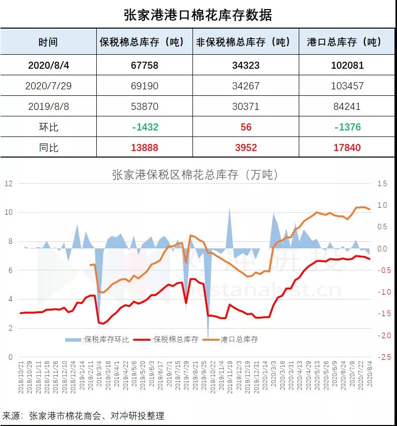 據(jù)張家港市棉花商會(huì),截止2020年8月4日,張家港非保稅棉34323噸,保稅棉67758噸,共102081噸。進(jìn)區(qū)1531噸,出區(qū)2964噸。
