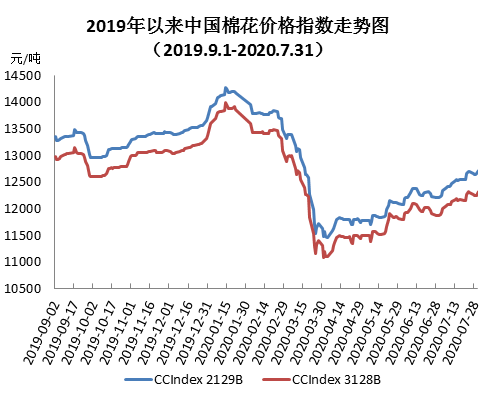 7月,紡企購買儲備棉積極性高漲,國內(nèi)棉市資源相對充裕,同時(shí)受淡季訂單不佳、開機(jī)不足、資金緊張等因素影響,紡企原料庫存保持低位。月末中國棉花價(jià)格指數(shù)(CCIndex3128B)12319元/噸,較上月末上漲453元;月均價(jià)11958元/噸,環(huán)比上漲198元,同比下跌1994元。