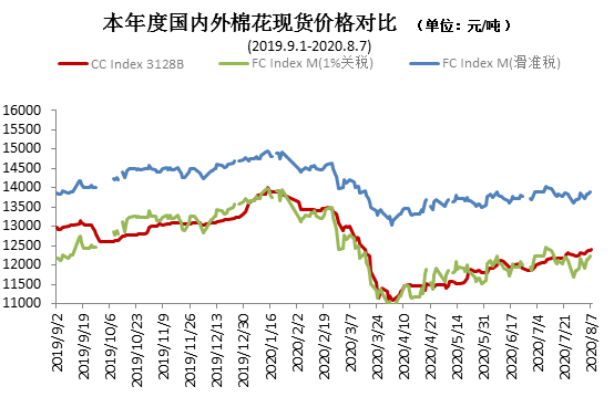 7月,受國外疫情持續(xù)、中美矛盾再度升級、棉花需求趨緩、美國棉區(qū)旱情有所發(fā)展等多種因素影響,國際棉價(jià)月內(nèi)大幅震蕩,整體呈現(xiàn)先抑后揚(yáng)走勢。中國進(jìn)口棉價(jià)格指數(shù)FCIndexM月均69.38美分/磅,環(huán)比漲1.04美分。月末69.62美分/磅,高于上月末1.87美分/磅,1%關(guān)稅下折人民幣12176元/噸,低于同期國內(nèi)現(xiàn)貨143元,內(nèi)外棉價(jià)差較上月末擴(kuò)大145元。