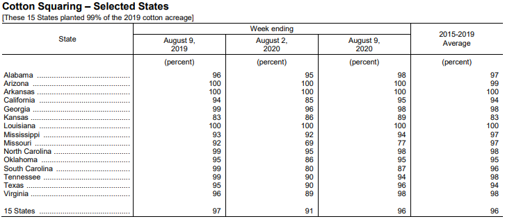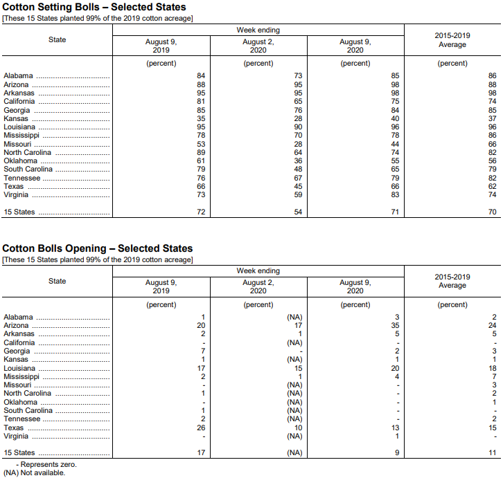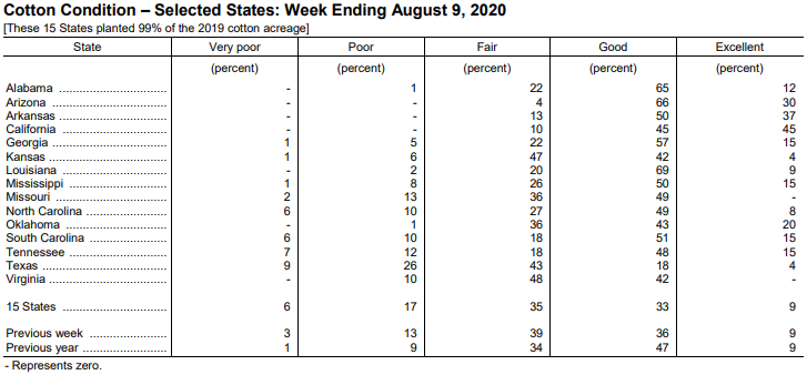 美國農(nóng)業(yè)部8月10日發(fā)布的美國棉花生產(chǎn)報告顯示,截至8月9日,美棉蕾鈴率為96%,前周為91%,去年同期為97%,5年均值為96%。美棉結(jié)鈴進(jìn)度為71%,前周為54%,去年同期為72%,5年均值為70%。美棉吐絮進(jìn)度為9%,去年同期為17%,5年均值為11%。美棉優(yōu)良率為42%,前周為45%,去年同期為56%;其中得州優(yōu)良率為22%,較前周減少3個百分點(diǎn),差苗率為35%,較前周增加11個百分點(diǎn)。