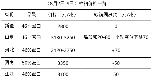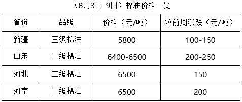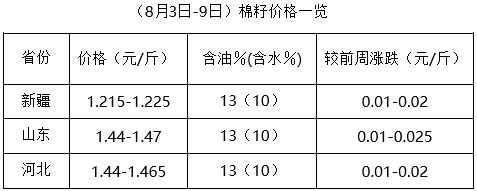 上周(8月3-9日),棉市外圍多空相持,期貨大豆及豆油、豆粕調(diào)整頻繁,先漲后跌,現(xiàn)貨豆油持續(xù)上漲,豆粕仍處跌勢,棉油、棉粕跟漲難跟跌。因棉籽資源量不足,棉籽價格持續(xù)上漲,油棉廠加工成本居高難下,進(jìn)一步支撐棉副產(chǎn)品行情,整體表現(xiàn)為漲多跌少,市場仍處進(jìn)一步調(diào)整中。