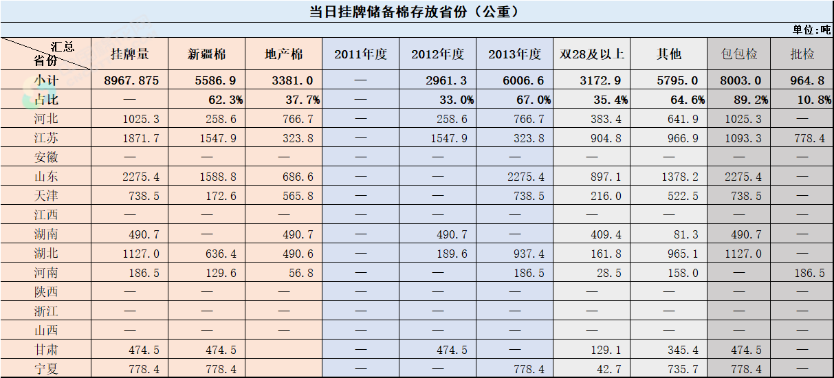 1.當(dāng)日輪出上市儲(chǔ)備棉中有部分為分批抽樣公檢。抽樣比率及抽樣方法按照棉花國(guó)家標(biāo)準(zhǔn)規(guī)定,品質(zhì)指標(biāo)包括顏色級(jí)、軋工質(zhì)量、長(zhǎng)度、馬克隆值、斷裂比強(qiáng)度、長(zhǎng)度整齊度指標(biāo);重量采用原入庫(kù)公檢結(jié)果,不再重新檢驗(yàn)。