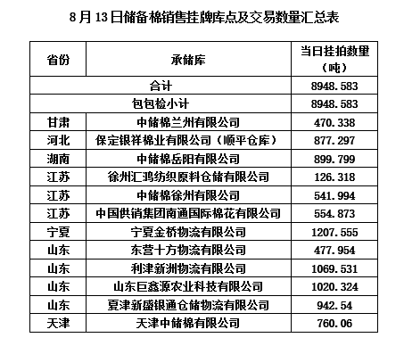 中國(guó)儲(chǔ)備棉管理有限公司定于8月13日上市銷(xiāo)售儲(chǔ)備棉重量8948.583噸,共38捆,其中新疆棉4321.948噸。