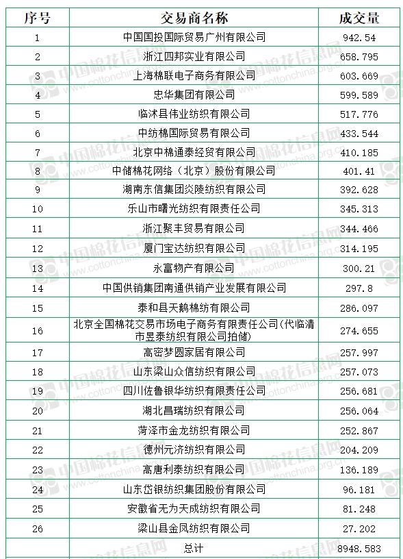 中國(guó)儲(chǔ)備棉管理有限公司定于8月13日上市銷售儲(chǔ)備棉重量8948.583噸,實(shí)際成交8948.583噸,成交率100%,成交均價(jià)11685元/噸,較12日下跌79元/噸,折3128價(jià)格12899元/噸,較12日下跌245元/噸。