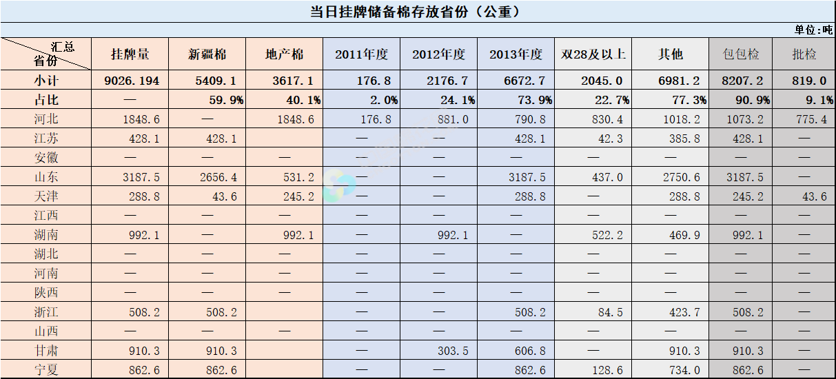 1.當日輪出上市儲備棉中有部分為分批抽樣公檢。抽樣比率及抽樣方法按照棉花國家標準規(guī)定,品質指標包括顏色級、軋工質量、長度、馬克隆值、斷裂比強度、長度整齊度指標;重量采用原入庫公檢結果,不再重新檢驗。