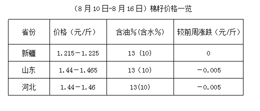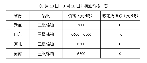 上周(8月10-16日),棉籽價格高位調(diào)整,成本難降,棉副產(chǎn)品出貨不快,油棉廠開工率下降,市場購銷量少。期貨大豆及豆油、豆粕震蕩難穩(wěn),難以提振棉油、棉粕行情,其中棉油滯漲企穩(wěn),個別走弱,棉粕多處跌勢,僅新疆地區(qū)個別地區(qū)有漲。