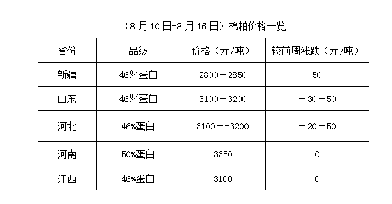 上周,期貨豆粕先低位下行,后止跌反彈,現(xiàn)貨相應(yīng)調(diào)整。周末沿海地區(qū)43%蛋白豆粕價至2840-2960元/噸,較上周波動10-20元/噸,難以支撐棉粕行情。目前棉粕與豆粕無差價優(yōu)勢,且46%蛋白棉粕價格遠高于43%蛋白豆粕價,多數(shù)飼料公司修改配方,增加豆粕使用量,打壓棉粕行情。且到港大豆數(shù)量較大,大豆廠開工率較高,時刻利空粕類行情,除新疆個別地區(qū)報價有漲,其它地區(qū)均呈小幅續(xù)跌狀態(tài)。但目前棉籽處青黃不接之時,成本居高,油棉廠開工率較低,8月份將陸續(xù)停機,棉粕供應(yīng)無壓力,市場抗跌能力仍存。新籽上市前,在參照豆粕走勢下,棉粕有望保持較強抗跌之勢運行。
