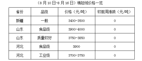 上周,棉籽價格高位調(diào)整,成本居高難下,油棉廠開工率下降,棉短絨供應(yīng)有限,但無奈下游化纖廠、精制棉廠開工率有限,對棉短絨隨用隨購,制約其行情發(fā)展,棉短絨漲跌兩難,各地報價維持穩(wěn)定為主。離新籽上市仍需時日,未來棉短絨受供求局面影響,行情仍將以穩(wěn)定之勢為主運行。