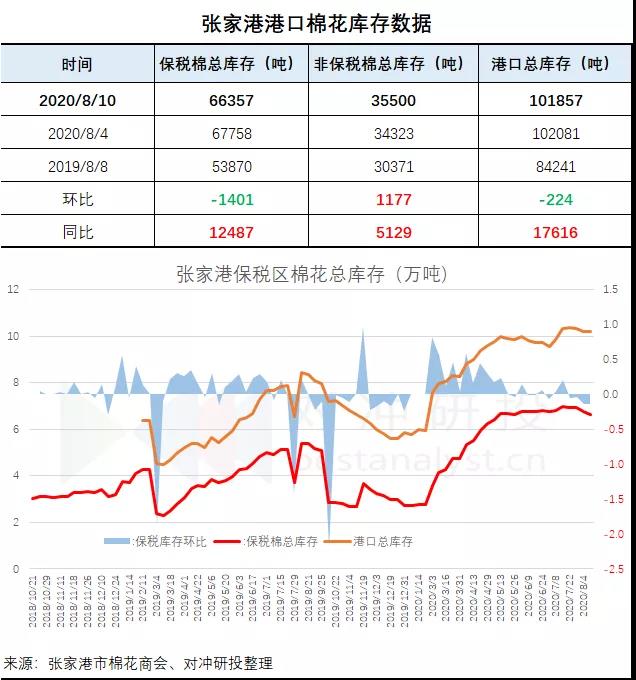 據(jù)張家港市棉花商會,截止2020年8月10日,張家港非保稅棉35500噸,保稅棉66357噸,共101857噸。進(jìn)區(qū)1983噸,出區(qū)2247噸。