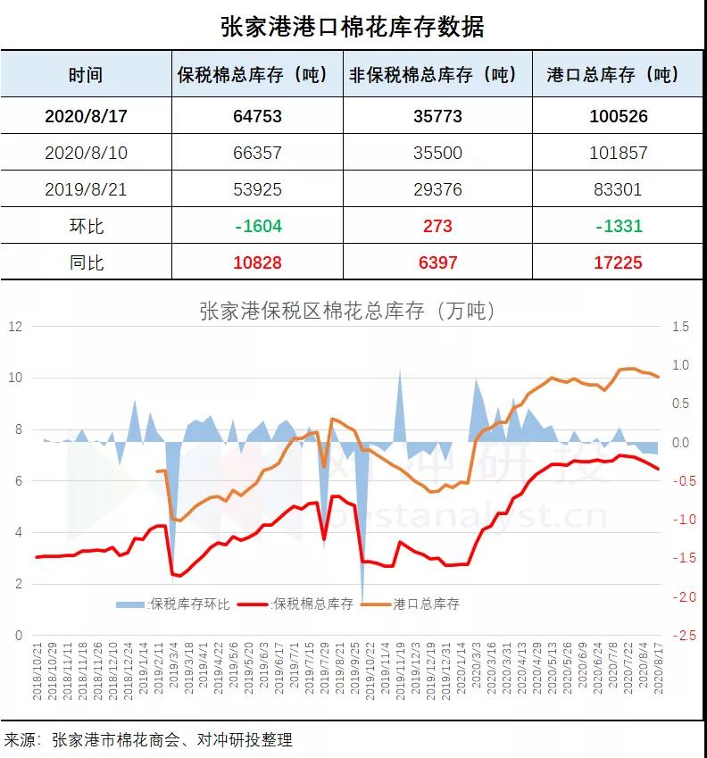 據(jù)張家港市棉花商會,截止2020年8月17日,張家港非保稅棉35773噸,保稅棉64753噸,共100526噸。進(jìn)區(qū)5046噸,出區(qū)6346噸。