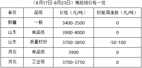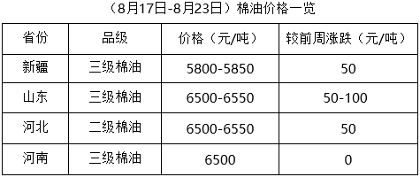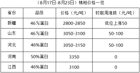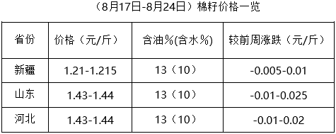 上周(8月17-23日),往年此時,部分地區(qū)棉籽已有零星上市,本年度受諸多因素制約,新籽上市仍需時日。下游棉副產(chǎn)品行情不穩(wěn),市場調(diào)整頻繁,庫存棉籽行情穩(wěn)定為主,個別地區(qū)持續(xù)走低,但受資源不足支撐,下跌幅度有限,油棉廠少量收購,市場靜待新籽上市。