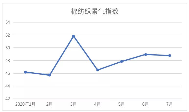 說明:中國(guó)棉紡織行業(yè)景氣指數(shù)采集自全國(guó)近500家次棉紡織企業(yè),參考國(guó)家制造業(yè)PMI等指數(shù)制定方式,通過對(duì)多個(gè)主要指標(biāo)加權(quán)計(jì)算得出,當(dāng)指數(shù)高于50,表示棉紡織行業(yè)本月景氣程度好于上月,低于50則表示本月景氣程度不及上月。