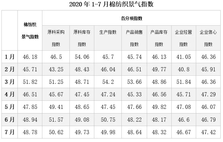 國(guó)內(nèi)方面,7月中國(guó)制造業(yè)采購經(jīng)理指數(shù)(PMI)為51.5%,延續(xù)上月向好走勢(shì),說明我國(guó)經(jīng)濟(jì)繼續(xù)保持回升狀態(tài)。從分類指數(shù)看,生產(chǎn)指數(shù)為54.0%,其中紡織服裝服飾制造自疫情以來首次升至臨界點(diǎn)以上,說明紡服生產(chǎn)已基本步入正軌。從需求端看,新訂單指數(shù)為51.7%,表明我國(guó)經(jīng)濟(jì)環(huán)境整體回暖,但紡服新訂單指數(shù)仍在臨界點(diǎn)以下,紡企經(jīng)營(yíng)壓力不減。生產(chǎn)、訂單方面與中棉行協(xié)調(diào)查問卷結(jié)果一致。