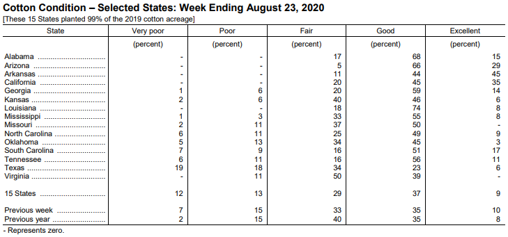 美國農(nóng)業(yè)部8月24日發(fā)布的美國棉花生產(chǎn)報告顯示,截至8月23日,美棉蕾鈴率為88%,前周為80%,去年同期為89%,5年均值為89%。美棉吐絮進度為22%,前周為15%,去年同期為27%,5年均值為19%。美棉優(yōu)良率為46%,前周為45%,去年同期為43%;其中得州優(yōu)良率為29%,較前周增加2個百分點,差苗率為37%,較前周增加4個百分點。