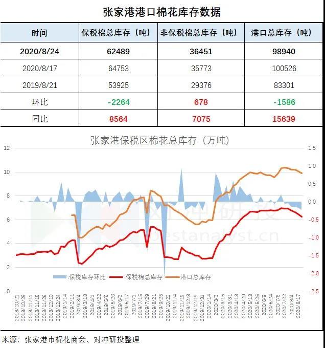 據(jù)張家港市棉花商會,截止2020年8月24日,張家港非保稅棉36451(環(huán)比+678)噸,保稅棉花62489(-2264)噸,共至98940(-1586)噸。張家港保稅區(qū)進(jìn)區(qū)2939噸,出區(qū)4539噸。