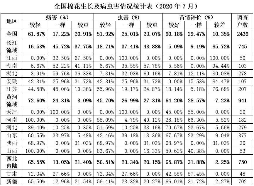 長江流域受6月底到7月底的嚴(yán)重漬澇災(zāi)害影響,部分棉花絕收,棉農(nóng)已改種玉米、大豆等農(nóng)作物,導(dǎo)致植棉面積環(huán)比減少4.5%。由于強(qiáng)降雨天氣,上部蕾鈴脫落嚴(yán)重,預(yù)測單產(chǎn)同比減少18.8%。同時,強(qiáng)降水過程,造成棉田排水不暢、濕漬害加重、氣溫偏低,不利于棉花現(xiàn)蕾開花和結(jié)鈴。江西、湖南、湖北等省均出現(xiàn)不同程度的棉花絕收的情況,安徽省局部地區(qū)棉田還有少量積水,棉花是否絕收還有待觀察。據(jù)調(diào)查,該流域7月份棉花面積為398.1萬畝,同比減少19.4%,環(huán)比減少18.6萬畝。因受災(zāi)導(dǎo)致棉花蕾鈴脫落嚴(yán)重,中上部幾乎空桿,因濕度較大,無法及時化控、施肥、打藥等管理,棉花瘋長,枯黃萎病頻發(fā)、棉鈴蟲和盲蝽蟓、蚜蟲等高發(fā),總體長勢較差。被調(diào)查戶中,棉花總體長勢較差的占總調(diào)查戶的85.7%,同比高59個百分點;病害發(fā)生較重發(fā)生的占總調(diào)查戶的37.8%,同比高37.8個百分點;蟲害較重發(fā)生的占總調(diào)查戶的43.9%,同比高38.7個百分點。截止到7月底,棉花平均每株蕾的比例為54.8%,同比減少9.0個百分點;花蕾的大量脫落嚴(yán)重影響后期產(chǎn)量的形成。該流域7月單產(chǎn)同比下降18.8%,預(yù)計產(chǎn)量為23.6萬噸,同比減少34.5%。