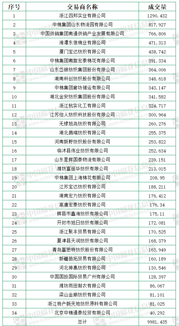 中國(guó)儲(chǔ)備棉管理有限公司定于8月27日上市銷(xiāo)售儲(chǔ)備棉重量9981.435噸,實(shí)際成交9981.435噸,成交率100%,平均加價(jià)11966元/噸,較26日下跌27元/噸,折3128價(jià)格13398元/噸,較26日下跌6元/噸。