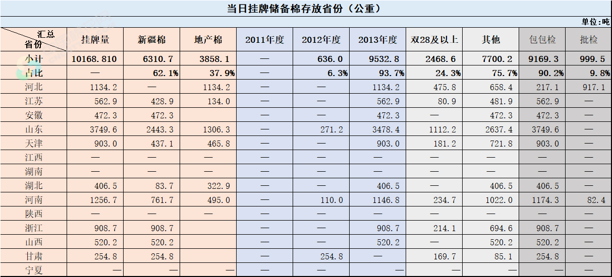 1.當(dāng)日輪出上市儲(chǔ)備棉中有部分為分批抽樣公檢。抽樣比率及抽樣方法按照棉花國(guó)家標(biāo)準(zhǔn)規(guī)定,品質(zhì)指標(biāo)包括顏色級(jí)、軋工質(zhì)量、長(zhǎng)度、馬克隆值、斷裂比強(qiáng)度、長(zhǎng)度整齊度指標(biāo);重量采用原入庫(kù)公檢結(jié)果,不再重新檢驗(yàn)。