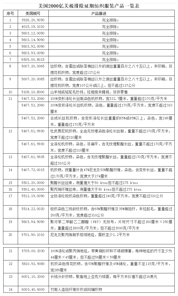 本次修訂的紡織品描述與HS碼如下,出口企業(yè)需重新審查是否符合排除條件: